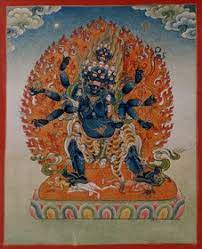 ATTRIBUTES: Club, image of Aksobhya, Noose, Pestle, Prayer Wheel, Staff, Sword, Tiger Skin, and trident.
