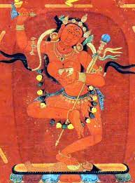 ATTRIBUTES: Principally club, cup, image of Vairocana on the crown and knife, but with an assortment of other attributes from time to time. Three-Eyed and Three-headed.