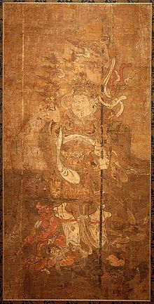 INFORMATION: One of seven deities concerned with fortune, he appears as a warrior in full armor holding a spear in one hand and a toy pagoda, identified as a "tower of treasure" in the other. He has been linked with the Bhddhist god Vaisravana (Kubera).