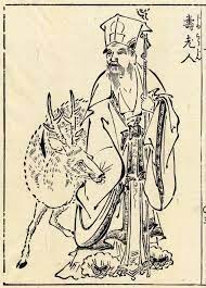 INFORMATION: One of seven deities in Shintoism concerned with fortune. He is depicted as a Chinese hermit and is sometimes confused with the god Fukurokuju. A small figure with a large head, he carries a staff to which is attached a little book. By tradition the book contains information about the lifespan of each mortal person. He is accompanied by a black deer, said to have been made thus by old age.