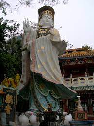 INFORMATION: Tin Hau originates as a mortal born on the island of Mei-CHou in the Fukien province of China, the daugther of a minor official. She died at the age of twenty-eight, having perfected herself and having experienced recurrent dreams of saving fishing boats from the waters close to her village. This tradition was inscribed on the wall of a sanctuary in Hangchow in 1228 CE. She was deified in 1278 by the Mongol emperor Kublai Khan, who introduced the title "queen of heaven". The first of the Ch'ing emperors subsequently conferred on her the title "imperial consort." She was thus subordinate only to Yu Huang Shang Ti, the Jade Emperor