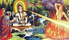 INFORMATION: A violent aspect of Siva in which he is depicted immolating Kama, the god of sexual love, using a blast of fire from his third eye. The reason given for this assault is that Kama had interrupted the ascetic meditation of Siva by making him desirous of Parvati.