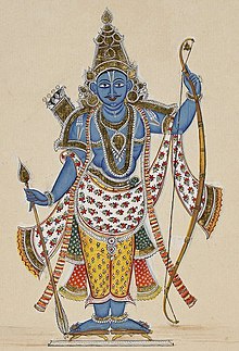 INFORMATION: The seventh avatara (sun aspect) of Visnu. Rama began as a comparatively minor incarnation who became one of the great heroes of the Ramayana epic, as well as featuring in the Mahabharata. The son of Dasaratha and Kausalya, he was a king of Ayodhya who, in the Ramayana, slew the demon Ravana that has captured his consort Sita and was upheld as a deity par excellence in respect of manhood and honor, though his subsequent treatment of his wife might be regarded as cavalier (see Sita). Rama rides in a chariot and is depicted in human form with two arms, typically holding a sugar cane bow and with a quiver at his shoulder. Also Ramacandra.