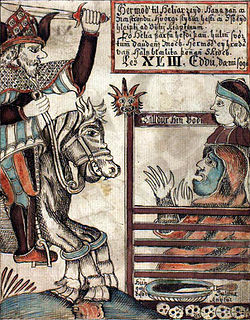 INFORMATION: One of the sons of the Viking god Othin, he was sent to Hel on a mission to obtain the release of the god Balder who had been slain by the blind god Hod. The mission failed because only one creature in the world, a hag (probably Loki in disguise), failed to weep at Balder's loss and Hermod returned empty handed. It may be argued that Hermod is less a deity than a demigod hero modeled on the Danish king of the Beowulf Saga. Also Heremod; Hermoth.