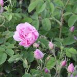 Var. versicolor (York and Lancaster Rose) Bears loosely double flowers, to 6cm (2½in) across, marbled pale pink and deep pink. |